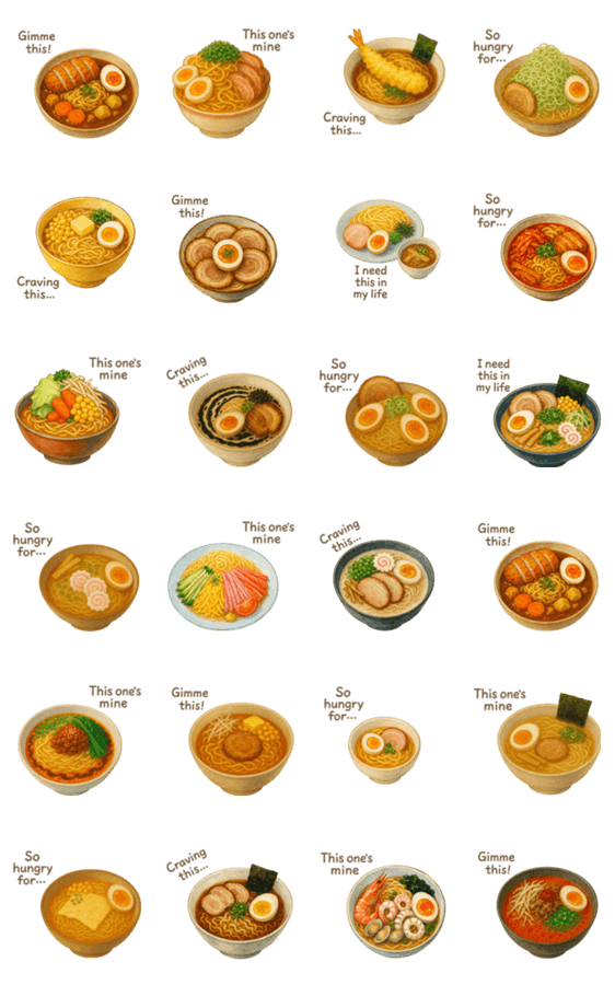 | スタンプ説明 | ラーメン好きさん、いらっしゃい! 毎日使いたくなるラーメンスタンプができました♪ その日の気分にぴったりな一杯で、おいしさと気持ちを届けよう! |