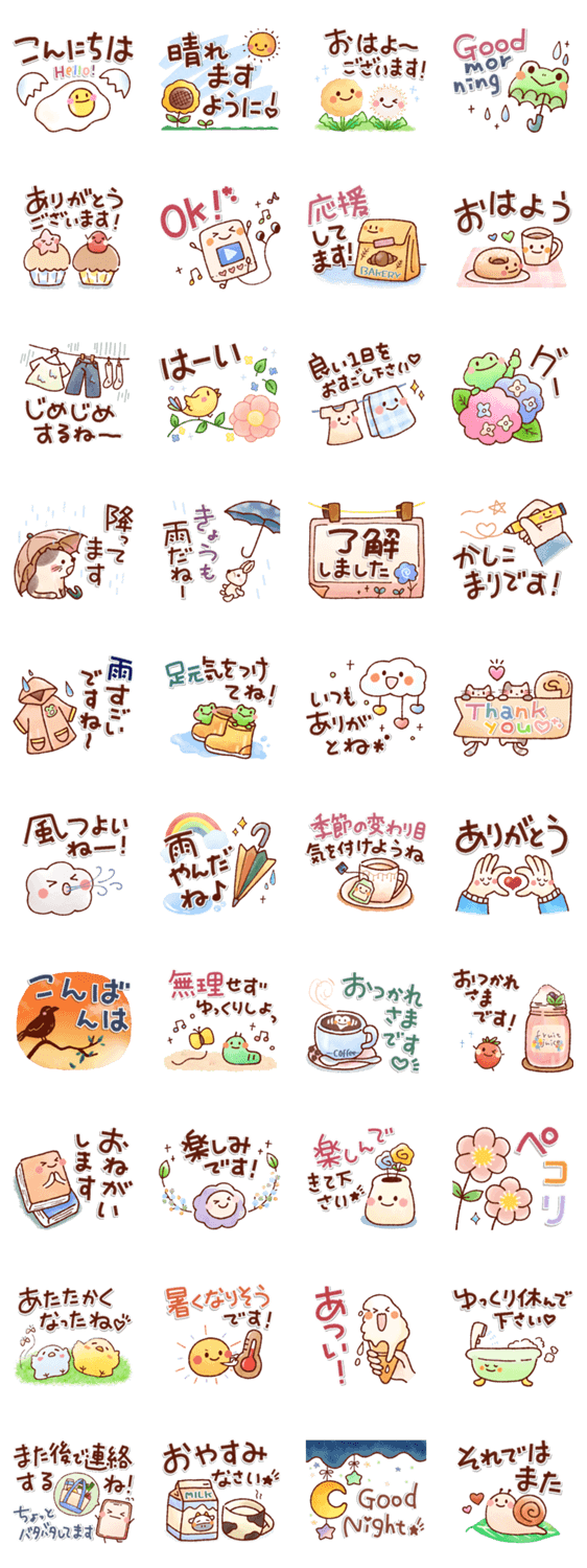 日常で優しく使える大人のゆる可愛いスタンプの初夏verです。あいさつ/挨拶/お返事/敬語/丁寧/気遣い/女性/女の子/ガーリー/かわいい/シンプル/おしゃれ/日常/毎日/雨/なつ