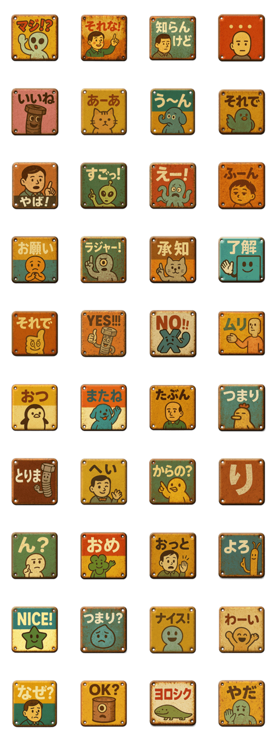 レトロなブリキ看板風スタンプ。 個性豊かなキャラとちょっとシュールなセリフで、日常トークが味わい深く。第2弾!