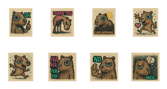 | スタンプ説明 | Chill capybaras, but make it weird. Embrace the glitch, the bizarre, and the beautiful chaos. Shatter norms, one warped sticker at a time. |