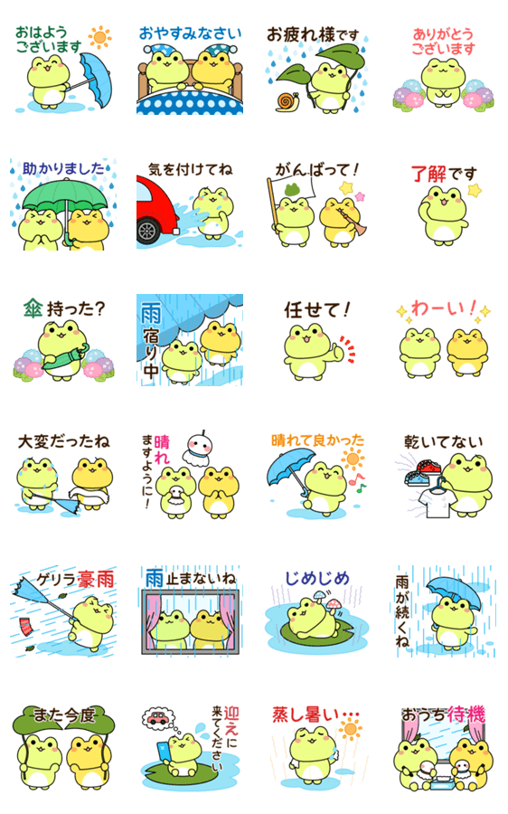 雨の日や梅雨の時期に使いやすい! カエルさんたちのスタンプの第2弾目です♪