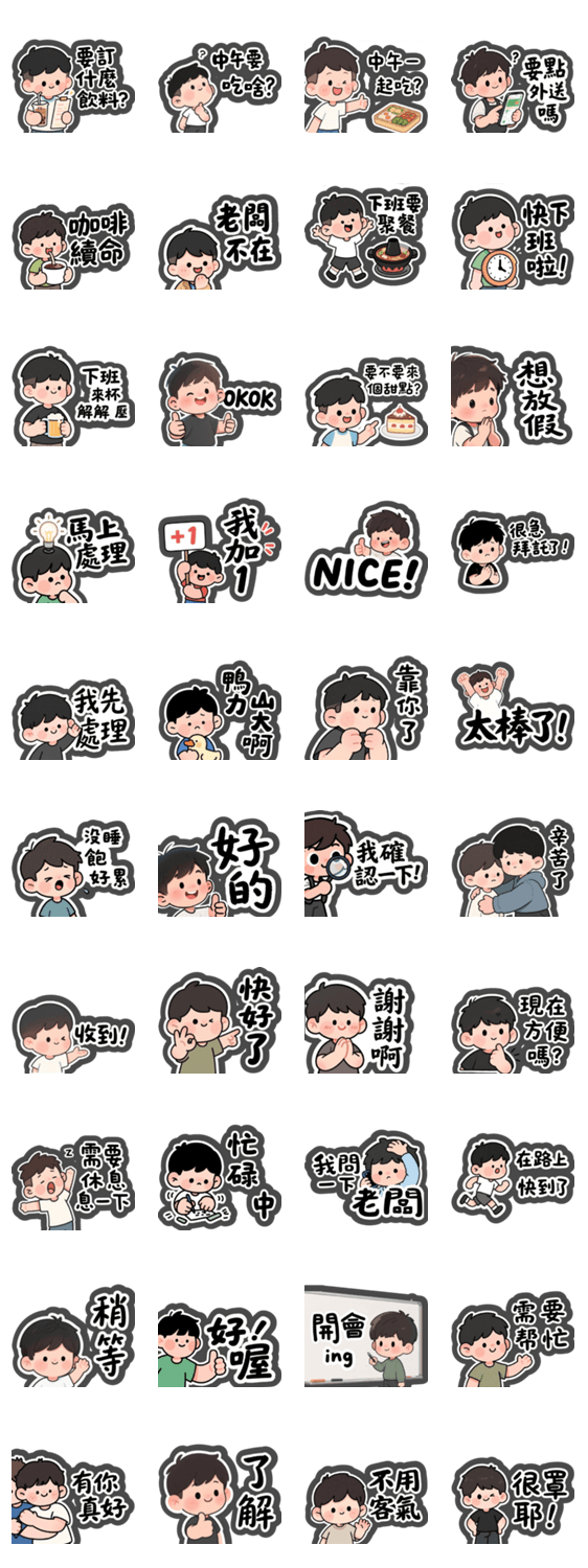 | スタンプ説明 | Useful workplace stickers featuring common daily conversations and mealtime scenarios perfect for smooth communication with colleagues |