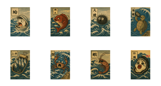 | スタンプ説明 | A hilarious set of sea creatures drawn in Ukiyo-e style! perfect for spicing up your daily chats with a salty laugh! |