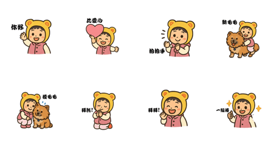 A cute girl in a bear hoodie and her fluffy dog bring joy in this sticker set. With greetings, hugs, laughs, and more, it's perfect for warm, expressive chats.