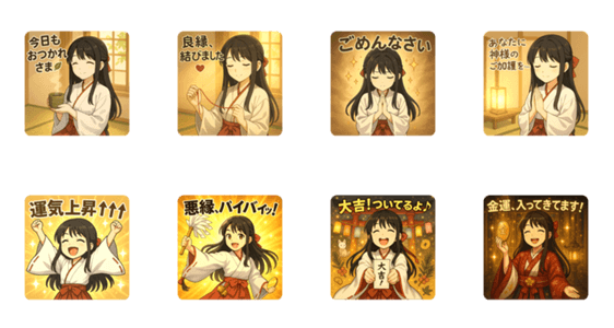 | スタンプ説明 | 日常に、ちょっと神様のご加護を──。 癒し系の巫女みのりが、あなたや大切な人にそっと運気を届けてくれるLINEスタンプです。 |