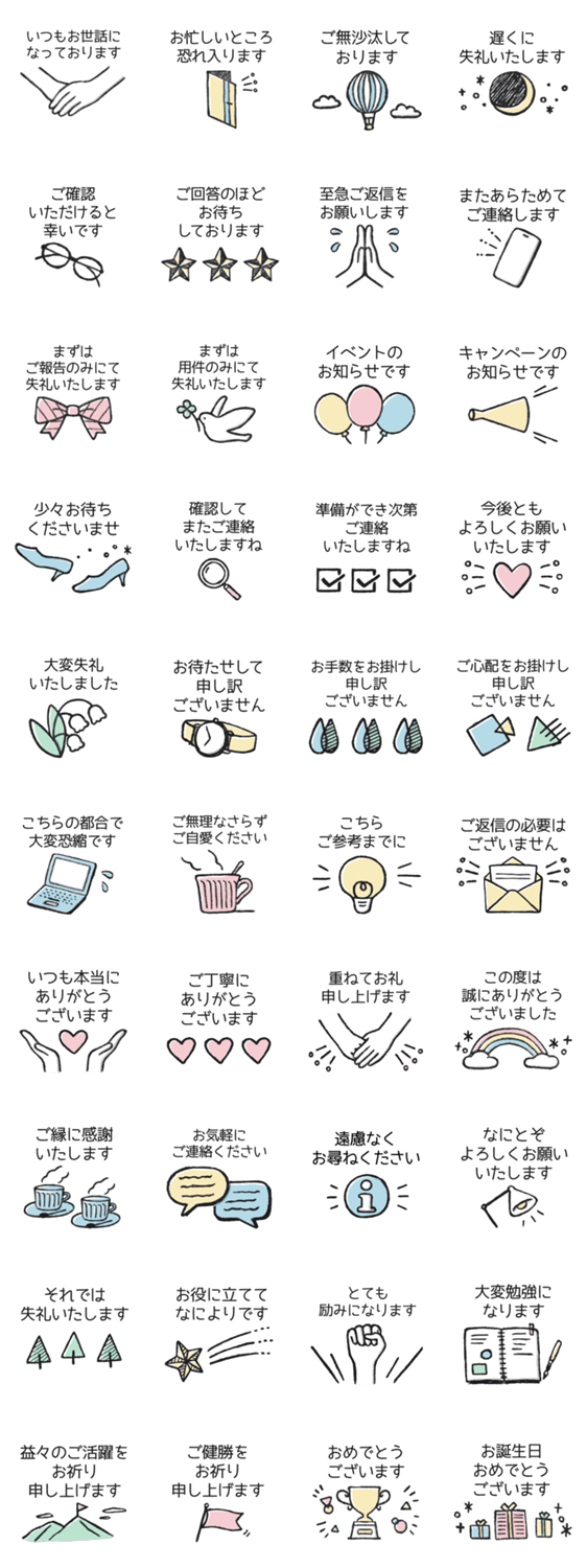 大人女性女子ビジネスお仕事営業連絡挨拶返信おしゃれかわいいゆめかわ社会人新入社員シンプルくすみパステルカラーお客様顧客取引先上司上品尊敬謙譲丁寧語メールスタンプ
