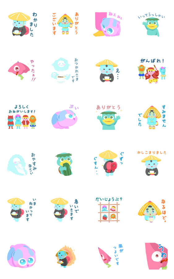 ほのぼのまあるい妖怪たちが、動きながら日常の気持ちを伝えてくれます。豆腐小僧や雨降り小僧、すねこすり、えんらえんらや家鳴りなど、個性豊かな仲間たちのstampです。