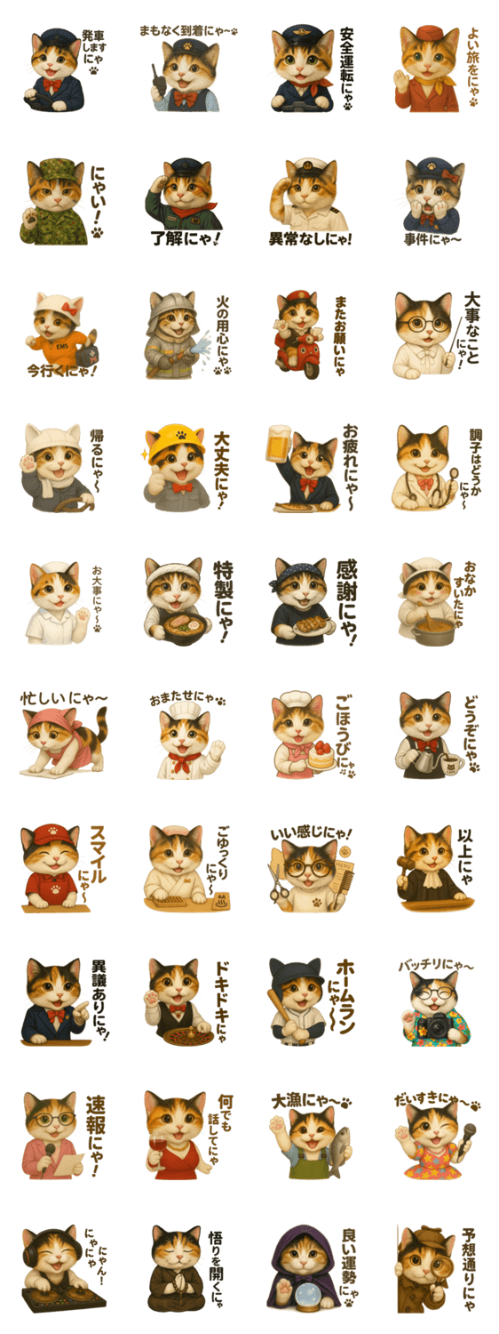AIで作成した、いろんなお仕事になりきる三毛にゃん(三毛猫)のスタンプ!自衛隊員から運転手、料理人まで40種類!