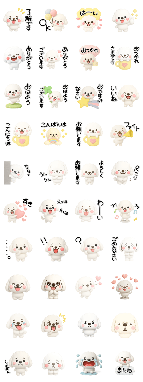 | スタンプ説明 | 毎日便利かわいいトイプードルのスタンプです。みんなでずっと使える内容を揃えましたのでスタンプ初心者の方にもオススメです。 |