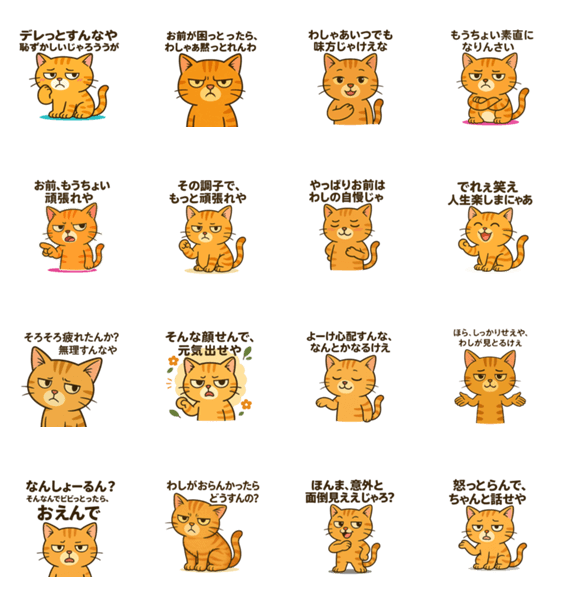 ツンデレ猫「ちゃぁ様」が、岡山弁バリバリでツッコんでくるスタンプ。濃いめの方言とクールな表情がクセになる!日常でもぜひ。