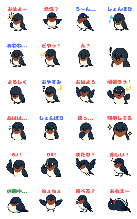 かわいいツバメが、日本語で挨拶、感情、日常のフレーズを表現します!毎日のチャットに魅力と楽しさを加えるのにぴったりです!