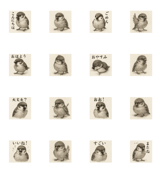 | スタンプ説明 | リアルな雀の絵を水墨画風にしてLINEスタンプにしました。 |