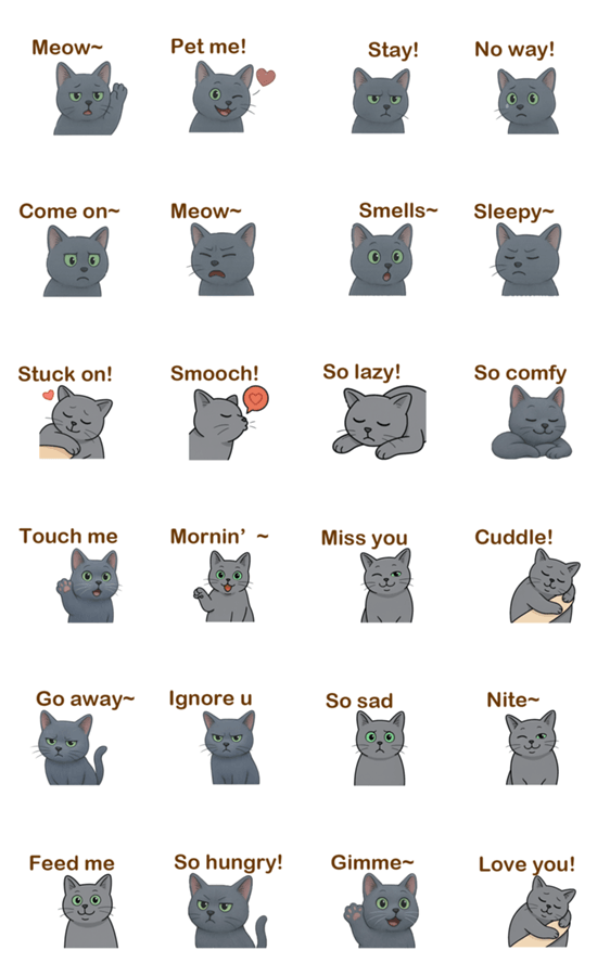 | スタンプ説明 | ルビーは甘えん坊のロシアンブルー。ナデナデとハグが大好きで、いつもあなたのそばにいたいにゃん! |