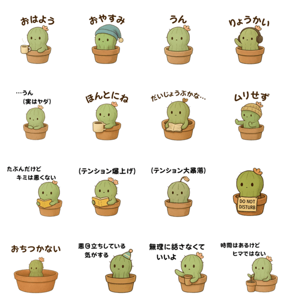 話したいときも、話したくないときも。 サボテンがトゲのないやさしさで、そっと気持ちを伝えるスタンプです。