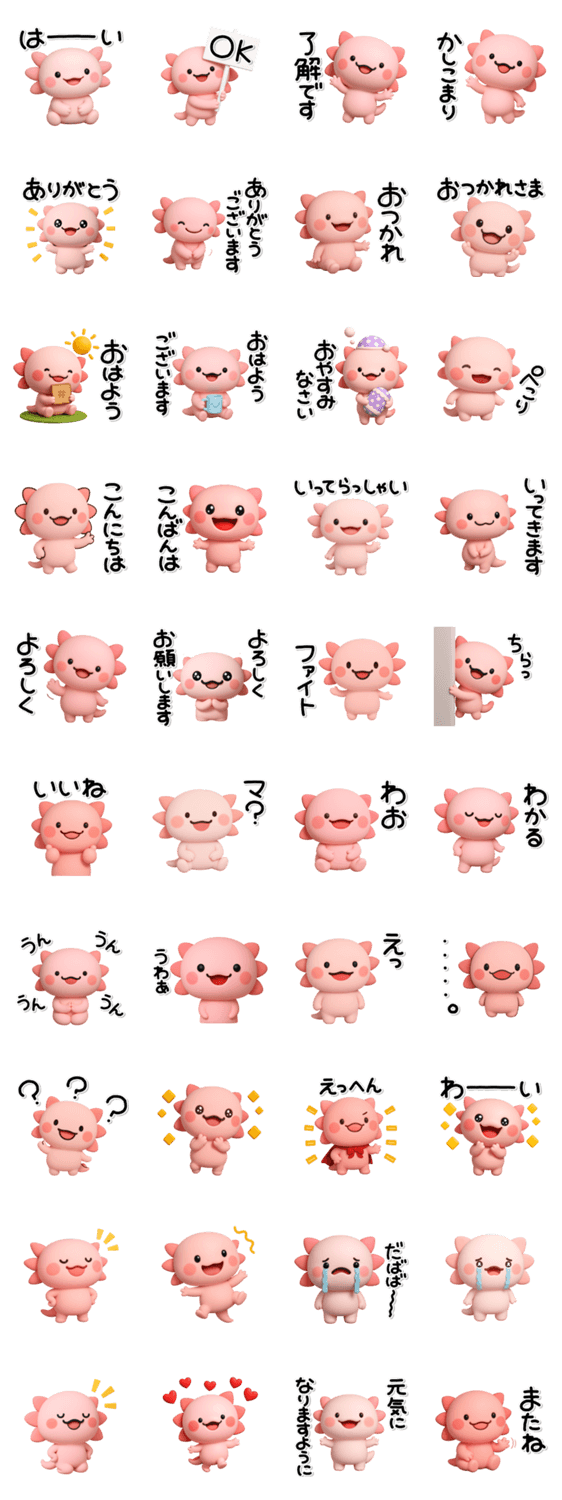 | スタンプ説明 | かわいいウーパールーパー達のスタンプです。ずっと使える内容を揃えましたのでスタンプ初心者の方にもオススメです。 |