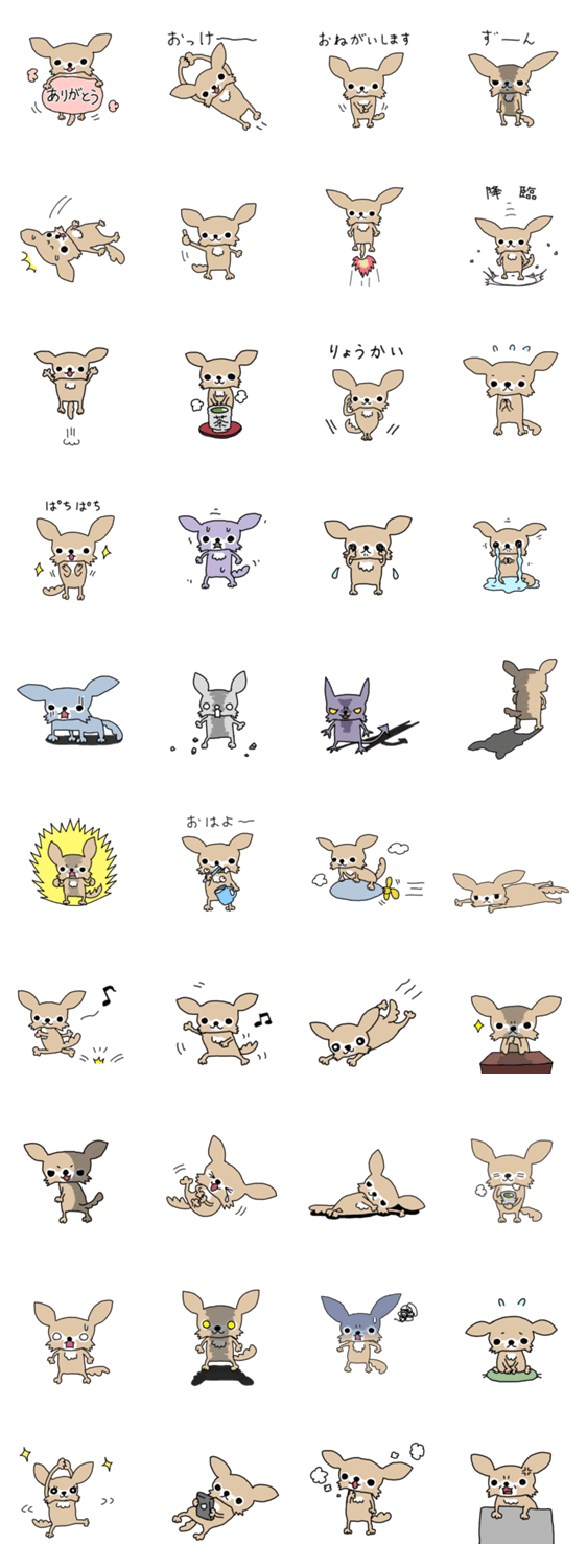 チワワのスタンプです。ゆるいキャラと豊かな表情で楽しく使いやすいように作りました。可愛いキャラや動物、犬が好きな方へ如何でしょうか。