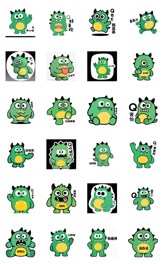 Cute little monster with big eyes, green body, orange belly, two small horns, triangular teeth and round body