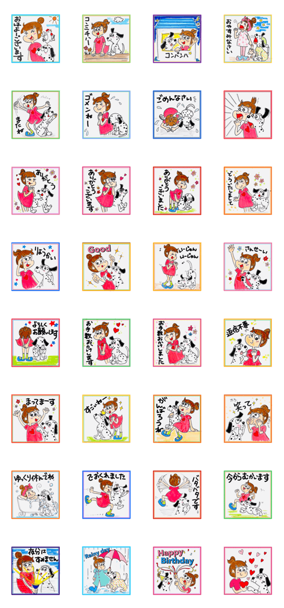 ダルメシアンと女の子を手描きイラストでコミカルなスタンプにしました