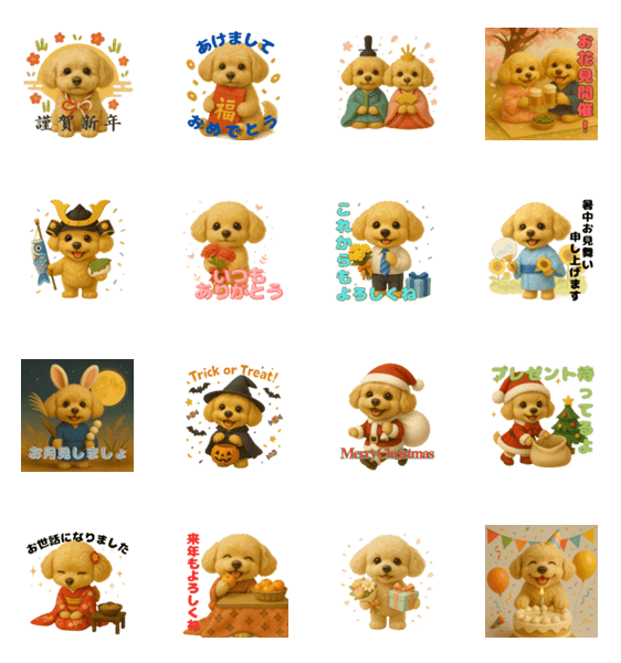 | スタンプ説明 | もっふり可愛いわんこが、季節の行事を彩ります。卒業、ひなまつり、ハロウィン、大晦日まで!毎年使える便利なスタンプです。 |