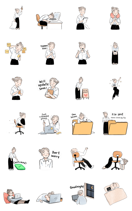 | スタンプ説明 | Not sure if she's working or just surviving. A sticker set for anyone doing their best (or pretending to) one lazy at a time. |