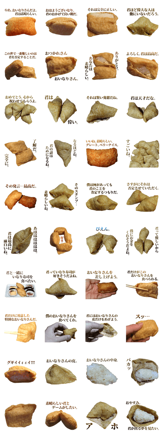 おいなりさんが相手のすべてを肯定するスタンプです。いなり寿司の手軽さのように、肯定というコミュニケーションをどうぞ。お稲荷さん、稲荷寿司、いなりずし。実写食べ物
