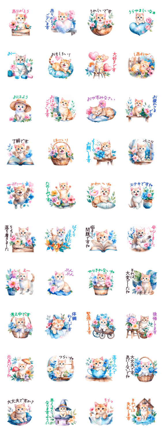 水彩の猫の感情を伝えるシンプルスタンプ。毎日/連絡/挨拶/敬語/丁寧/グループ/家族/友達/PTA/ママ友/猫/ねこ/ネコ/子猫/子ねこ/感情を伝える