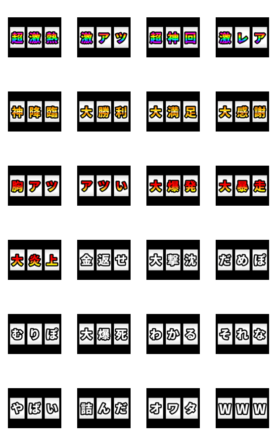 左から順番に文字が現れ3文字の単語が完成するスタンプ。勿体ぶりたい報告にオススメ! 面白い/ネタ/ガチャ/ゲーム
