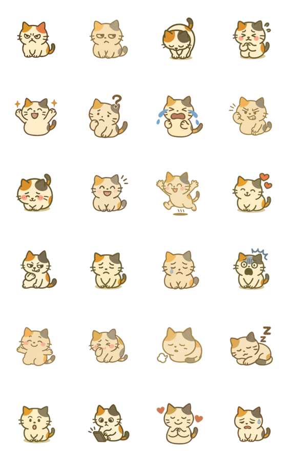 ころんと丸い三毛ねこが、もっといろんな気持ちをころころ表現!感情豊かでかわいさ倍増、文字なしで気持ちが伝わる癒し系スタンプです。