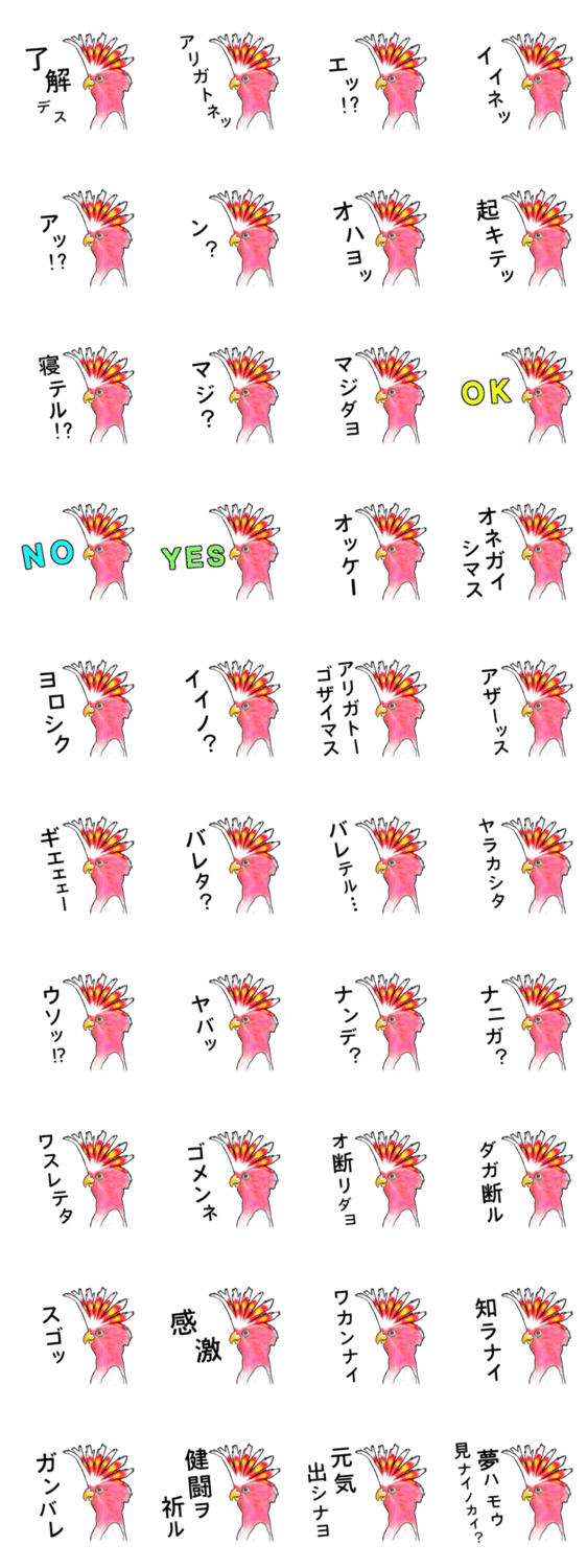 クルマサカオウムのカラフルなスタンプです。気持ちを明るくしたいときや、相手を笑顔にしたいときに使ってください。
