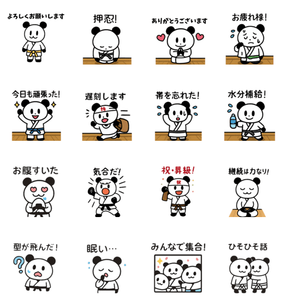 空手をがんばる「ぱんだぴ」のスタンプ!日常や応援、仲間との会話にぴったり。みんなで楽しく使おう!