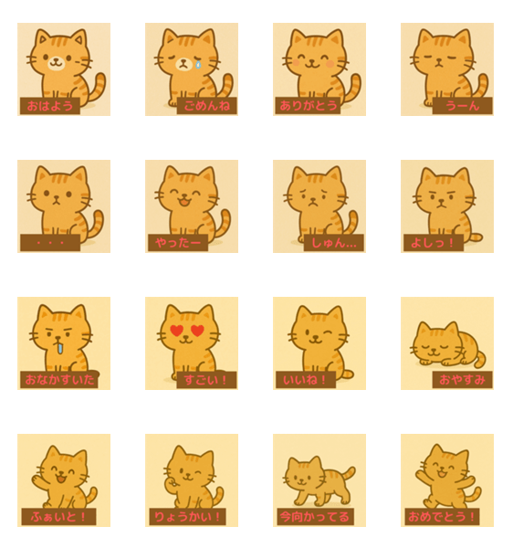 かわいくて表情豊かなもちもち茶色ネコが、あなたのトークをもっと楽しくします!元気なあいさつからおもしろい気分まで、このネコが気持ちをぜんぶ伝えてくれます。