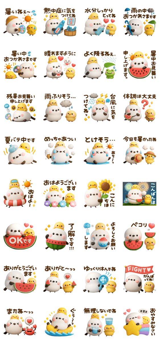 夏に役立つ言葉がいっぱい♡シマエナガとぴよこのスタンプです。