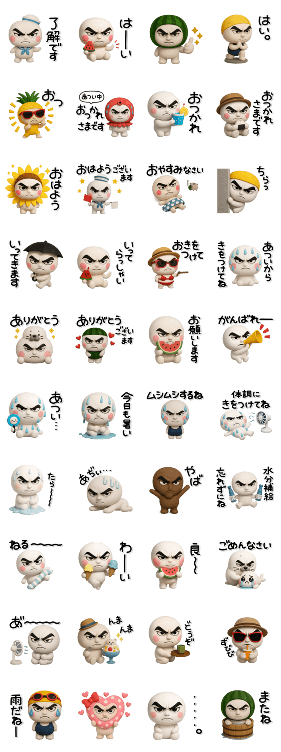 | スタンプ説明 | 鋭い目で圧が強い子達の夏のスタンプです。刺激やインパクトを求める方におすすめです。 |
