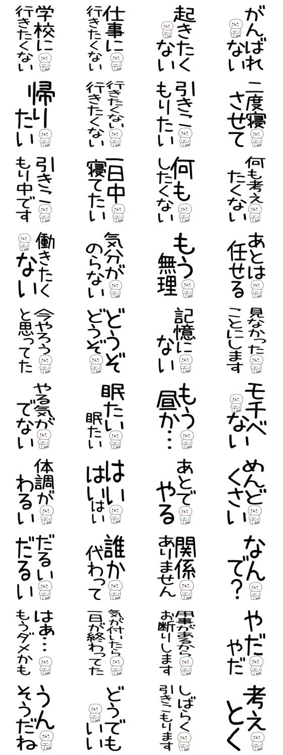 引きこもりたい言葉をまとめた老眼でもバッチリ見える引きこもりスタンプです もるきゅた作 ※このスタンプはトークルームで大きく表示されるBIGスタンプです。