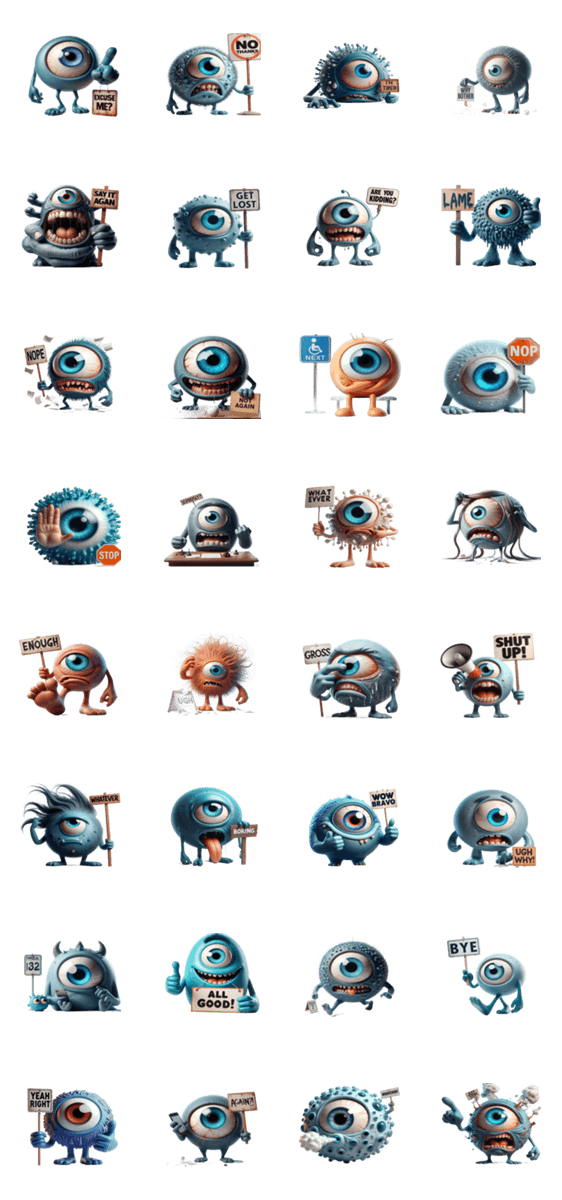 | スタンプ説明 | "眼球モンスターの白目連発スタンプ!呆れ・冷ややか・厭世な気持ちにぴったり," |