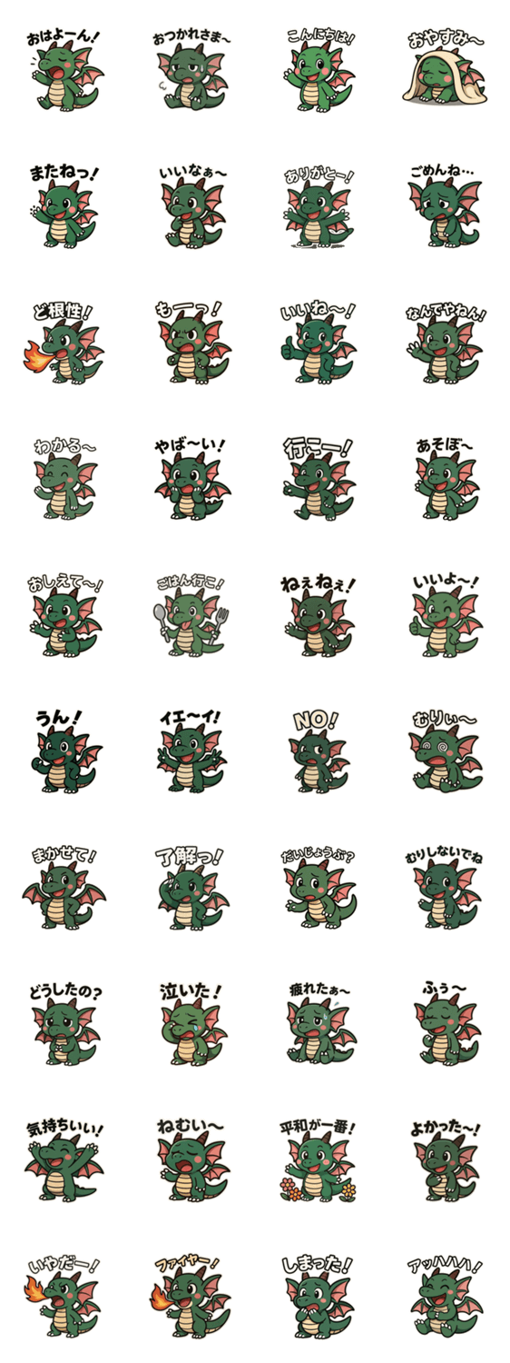 親子で使える楽しいグリーンのドラゴンのスタンプです。日常のコミュニケーションや言葉だけでは物足りないときに便利にご利用いただけます。挨拶や感情の40枚セット!!