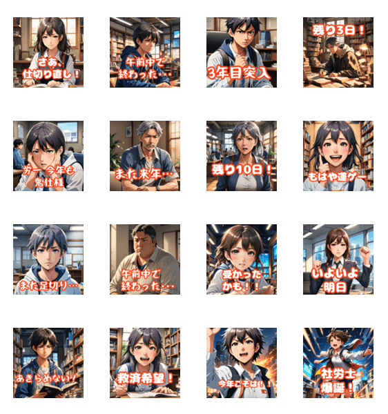 | スタンプ説明 | 社労士受験生のあるあるネタをスタンプにまとめました。社労士受験を経験した方向けに特化したスタンプです。 |