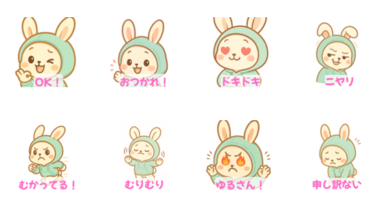 | スタンプ説明 | ミント色のパーカーを着たふわふわうさぎ!日常のいろんな気持ちをこの表情豊かな相棒で伝えよう! |