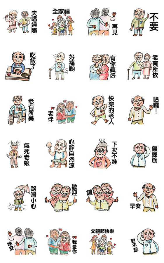 | スタンプ説明 | Happy Grandpa and Grandma Stickers, Illustrated by a 95-Year-Old Artist. |