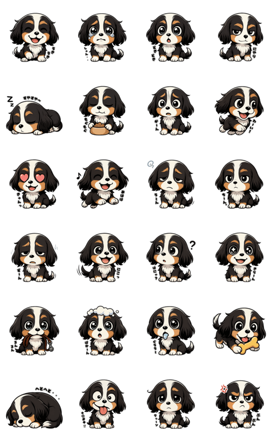表情たっぷりのキャバリアの子犬スタンプ。かわいくて、愛おしい、いろんな気持ちにぴったり!シンプルでとても使いやすいだワン!
