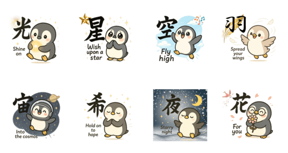 | スタンプ説明 | 空・星・光・希望…。書道漢字と、もちぺんの優しい表情で“願い”を伝えるシリーズ第2弾。英語訳つきで海外の友達にもぴったり! |