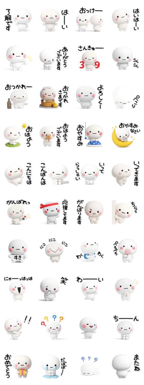| スタンプ説明 | しろくてまるい子たちのスタンプです。みんなでずっと使える内容を揃えましたのでスタンプ初心者の方にもオススメです。 |