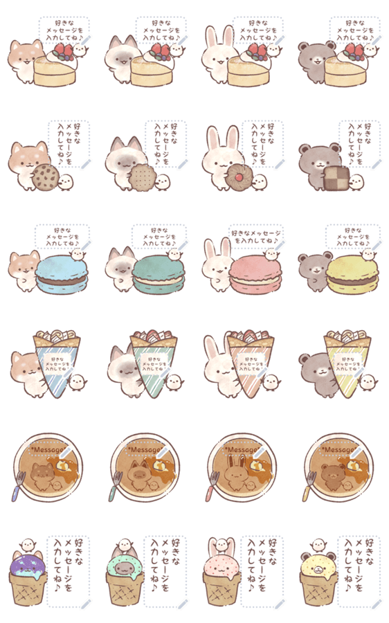 | スタンプ説明 | くすみカラーな犬・猫・ウサギ・クマとシマエナガのスタンプ第二弾。 今回はスイーツがテーマです。 文字を入力できる「メッセージスタンプ」なので好きな文章で送れます♪ 現在この商品は一部のスマートフォン版LINE 10.3.0以上のトークルームでのみ使用できます。動作環境の最新情報はヘルプをご確認ください。 |