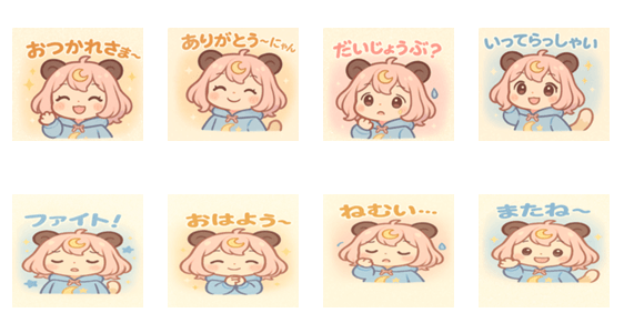 | スタンプ説明 | Meet Luna Poyo a dreamy mix of cat, dog & panda. She loves the moon & stars, and gently cheers you up with her soft, fluffy charm. |