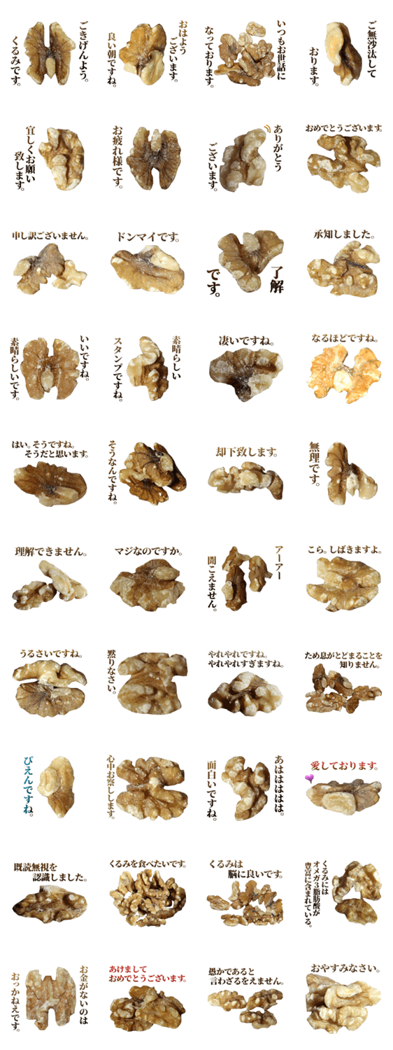 くるみの、年中使える敬語のスタンプです。敬語かつ、一年中毎日使える内容ですので便利です。クルミ、木の実、ナッツ、オメガ3脂肪酸。実写食べ物スタンプシリーズ。