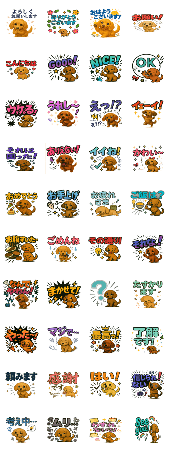 表情豊かなダックスと大きな文字で気持ちを伝える、使いやすいリアクションイラストセット。背景透過で便利。