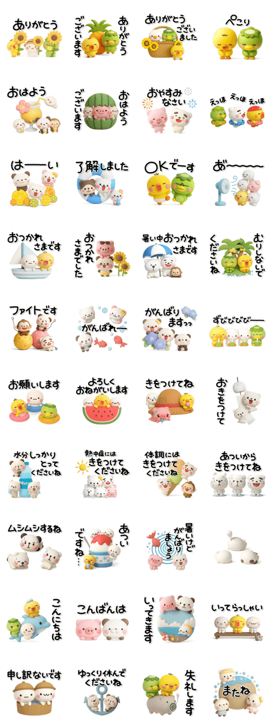 | スタンプ説明 | たくさんのキャラ大集合の夏作品です。全体的に落ち着いた色合いですので大人の方にもピッタリです。使いやすい内容を厳選していますので初心者の方にもオススメです。 |