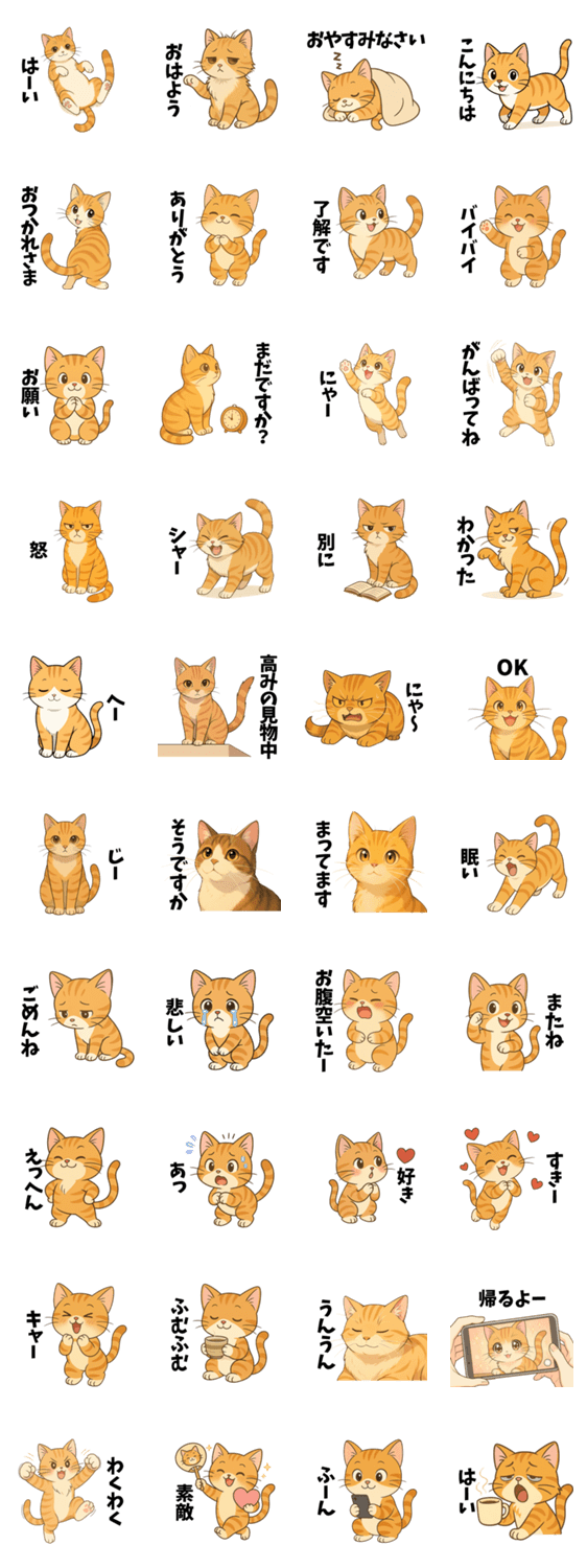 もこふわな茶トラ猫が日常の気持ちを伝える40種のスタンプです。