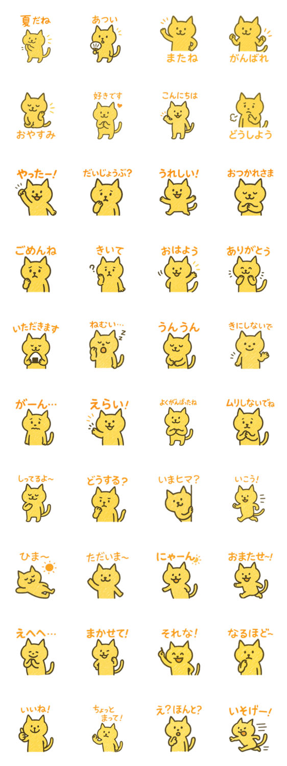 猫のようなスタンプです。日常会話、返答、思いや感情をフレーズにしました。