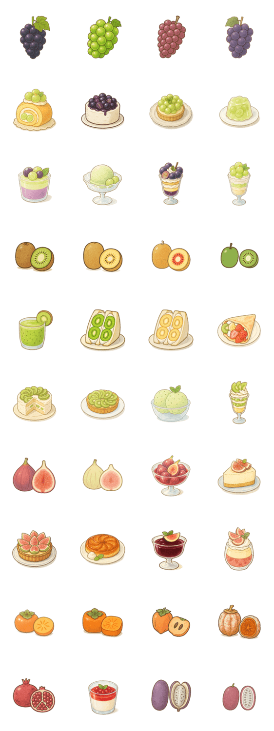 | スタンプ説明 | 秋の果物、ちょっと渋めの果実、山のめぐみ。ブドウ、キウイ、イチジク、柿、ザクロ、アケビ…少し個性的で、どこか懐かしい。シンプルで使いやすいスタンプになりました。 |